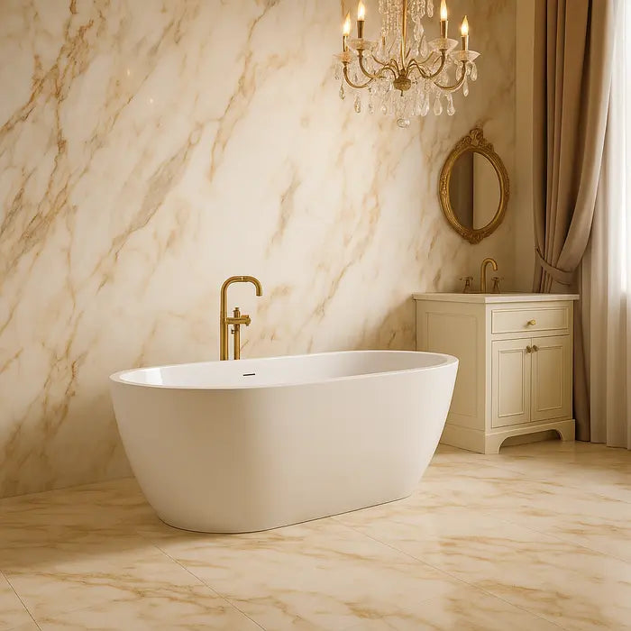 Mark the entrance to your home with this luxurious statuario tile for it's great for accent walls while also complimenting open-concept living rooms and bathrooms designed to look like a spa.